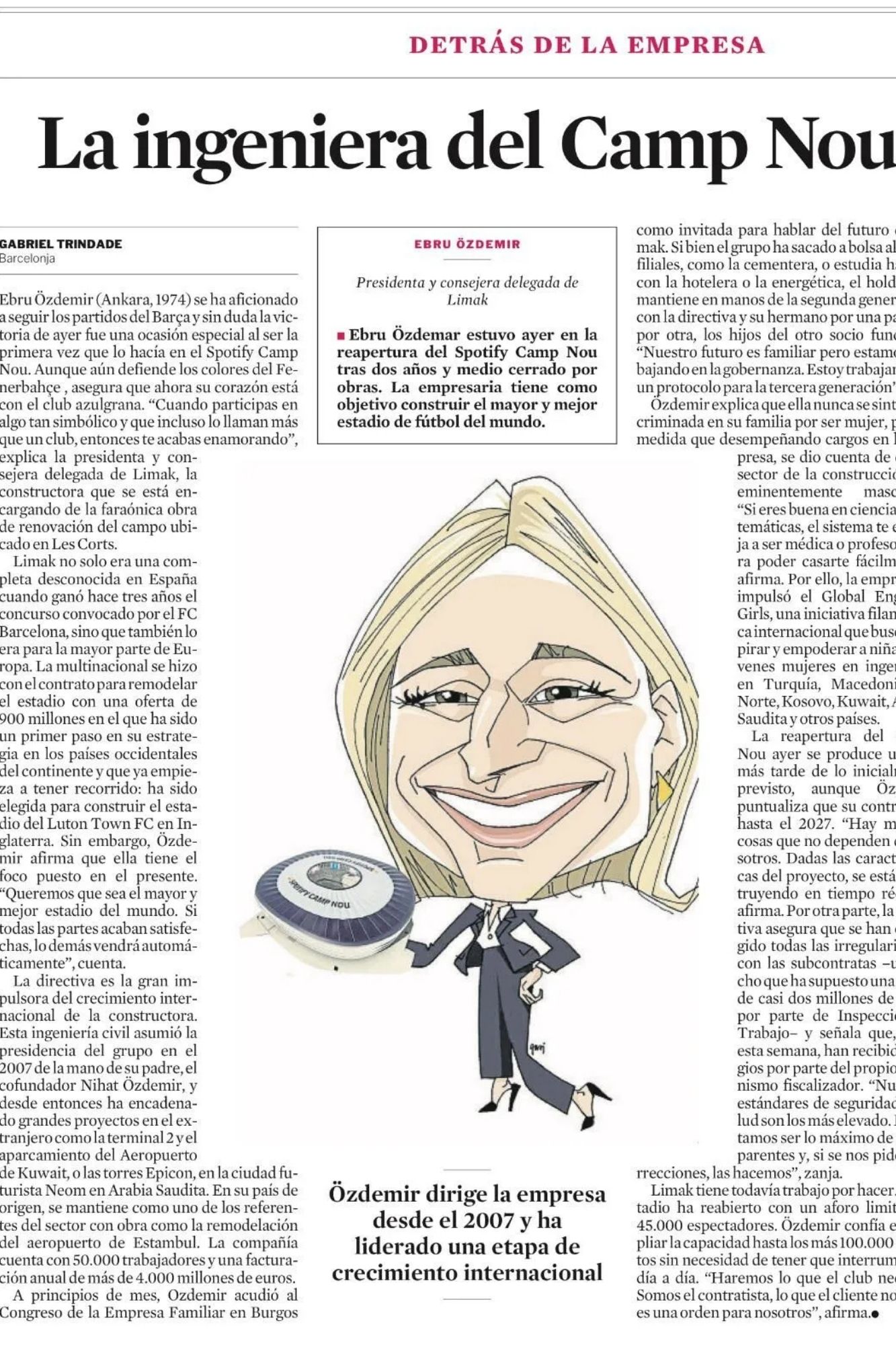 Avrupa’nın en büyük stadyum yenileme projelerinden biri olan Spotify Camp Nou, yeniden açılışıyla uluslararası medyanın odağına yerleşti. Bunun bizim açısından önemi ise “Avrupa’nın En Büyük Stadyum Projesinin Arkasında Bir Türk Liderin olması… Haberde, ‘Avrupa’nın en büyük stadyum yenileme projesi’ olarak tanımlanan Camp Nou’nun teknik ve operasyonel boyutlarına dikkat çekilirken, Ebru Özdemir’in ‘mühendislikten küresel iş liderliğine uzanan’ kariyer yolculuğu öne çıkarıldı.